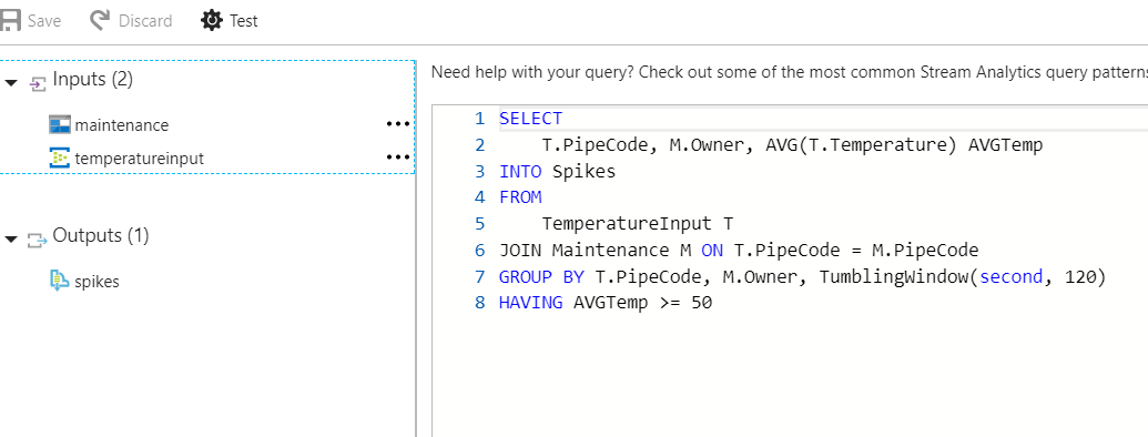 SELECT T.PipeCode, M.Owner, AVG(T.Temperature) AVGTemp INTO Spikes FROM TemperatureInput T JOIN Maintenance M ON T.PipeCode = M.PipeCode GROUP BY T.PipeCode, M.Owner, TumblingWindow(second, 120) HAVING AVGTemp >= 50