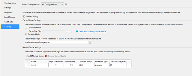Tick Enable Caching, also notice that Dedicated Role option is disabled since this is a Web Role. You can specify the amount of cache size in percentage. You can notice that it says Cache Cluster settings. This is because Azure roles can run on more than one instance when the role runs on more than one instance this forms the cache cluster. A cache cluster is a distributed caching service that combines all the memory from all the running instances.