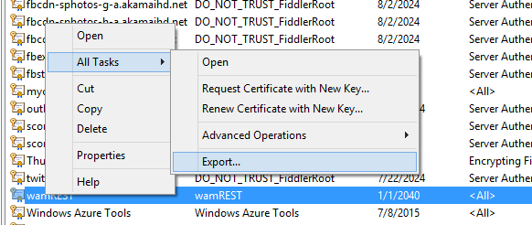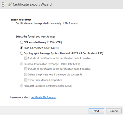 Export the certificate from certificate store, as a .cer file. Follow the screen shots below.