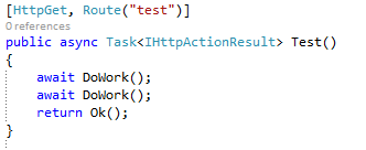 Since most projects start with the Web API, let me start the discussion from there. In a Web API action like below, the async in the action method helps the IIS threads not to be blocked till the end of the call and return immediately, thus increasing the throughput of the IIS.