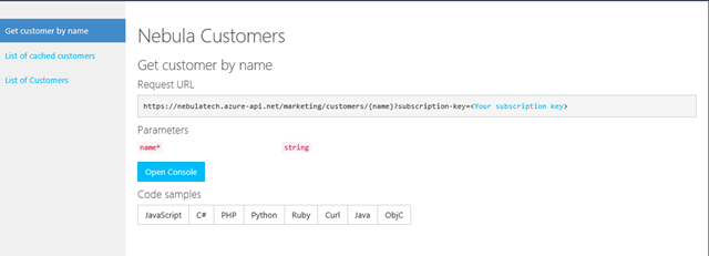 http: //nebulacustomers.azurewebsites.net/api/customers?name=<name> – Gets the specified customer object.