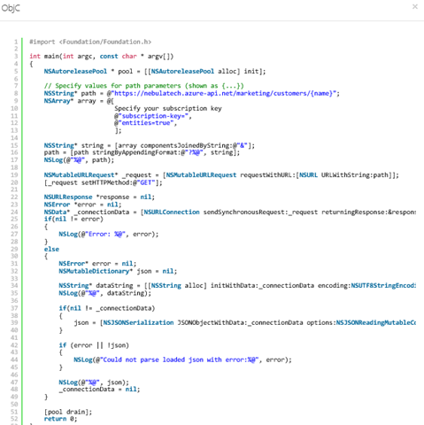 Similarly invoke the Get customer by name specifying a parameter. The coolest part of the Developer Portal is that it’s really helpful for the developers to test the endpoints and also it generates the code in may languages on how to consume those endpoints. Below is the code generated in Objective C for consuming the customer name endpoint.