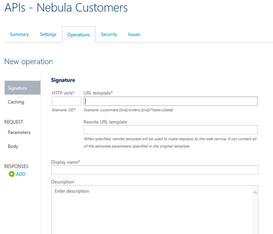 Technically speaking operations are trigger points of the web service in the API Management. Click on the API we created (Nebula Customers) and select the Operations tab and click on ADD Operation.