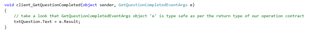 Once the Method call is returned from the service, the following method will be fired. (Note that GetQuestion() is the method we created. GetQuestionAsync() is generated by VS. We have to simply call that. (If you are familiar with Silverlight then this is not a big deal for you)).