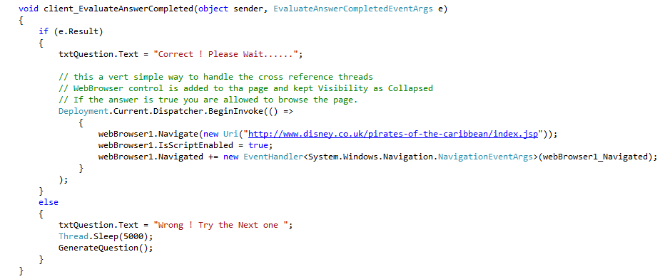 WCF service is responsible for generating the questions and evaluating the answer. Thread is used to load the web browser.  Browser object is in the Collapsed Visibility mode, and the thread used to navigate the page, and bind the delegate of Navigated event.
