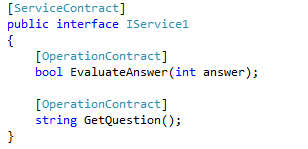 In my WCF service I have 2 operational contracts. One is to generate the question and the other one is for evaluate the answer. (Read the comments within the code blocks)