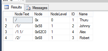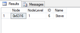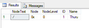 Here I’ve passed the HierarchyId::GetRoot() as the value for the Node. Few things to note here, we ask the SQL Server to give us the HierarchyID of the root node. We use the SQL CLR function GetRoot for this. The :: is marked because GetRoot is a static method inside the HierarchyID SQL CLR data type.